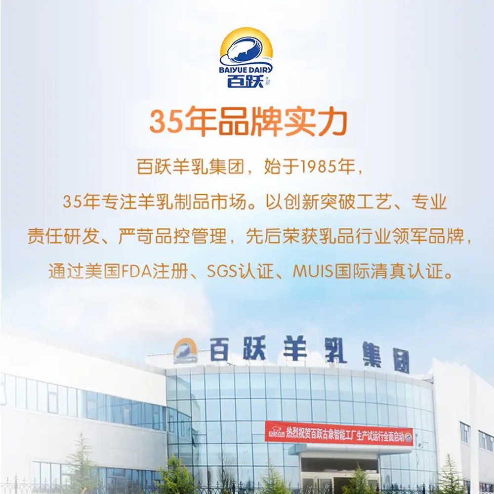 西安百躍羊乳集團(tuán)有限公司是一家集羊乳研發(fā)、收購(gòu)、生產(chǎn)、銷售于一體的集團(tuán)化公司。成立于1985年,位于西安市閻良區(qū),主要從事羊乳制品的研發(fā)、生產(chǎn)、銷售和服務(wù),具有自建奶源基地,是國(guó)內(nèi)規(guī)模最大的羊乳加工企業(yè)。目前,已發(fā)展成一家擁有多個(gè)子公司的集團(tuán)化企業(yè),擁有百躍羊乳(合水)古象有限公司、百躍羊乳(南寧)有限公司、西安國(guó)品乳業(yè)有限公司、西安御恭羊乳有限公司、西安御寶羊乳品營(yíng)銷有限公司,及控股公司陜西百躍優(yōu)利士乳業(yè)有限公司,F(xiàn)有職工238人,總資產(chǎn)達(dá)10 億元,無(wú)負(fù)債。