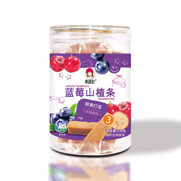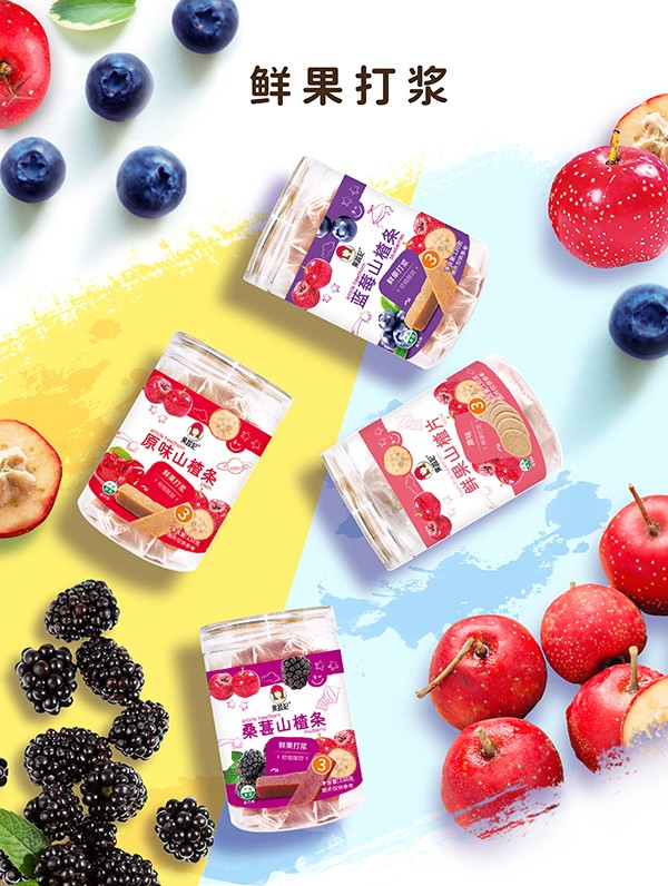 果蔬妃原汁山楂,原料十分簡單,將新鮮山楂蒸熟后去籽,然后添加鮮果打漿的蘋果、藍(lán)莓和桑葚等,烘烤成型后切塊,獨(dú)立包裝保持水分,最終得到幫助寶寶開胃消食、軟糯可口的果蔬山楂!