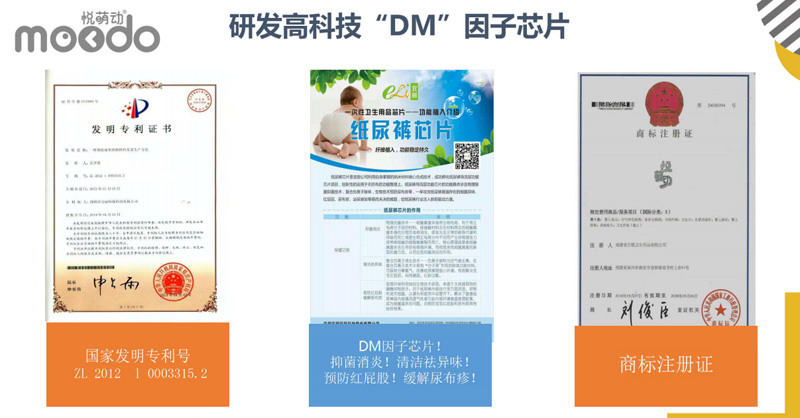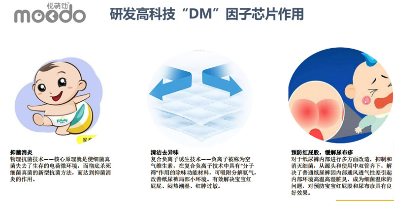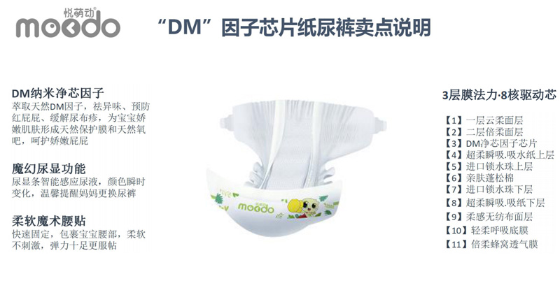 悅萌動品牌,產(chǎn)品涵蓋紙尿褲、悅動褲系列,輕薄防漏,羽柔舒適,DM因子芯體,獨(dú)具特色。DM因子(diatom)是一種具有分子篩結(jié)構(gòu)的材料,該種結(jié)構(gòu):具有極強(qiáng)的物理吸附和離子轉(zhuǎn)換性能!能有效的吸附尿尿所產(chǎn)生的異味、能夠預(yù)防紅屁股。