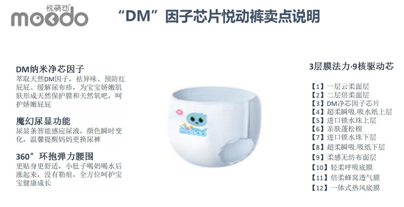 品牌名稱:悅萌動 主營產(chǎn)品:悅萌動紙尿褲,悅萌動悅動褲 品牌特色:輕薄防漏,羽柔舒適,DM因子芯體