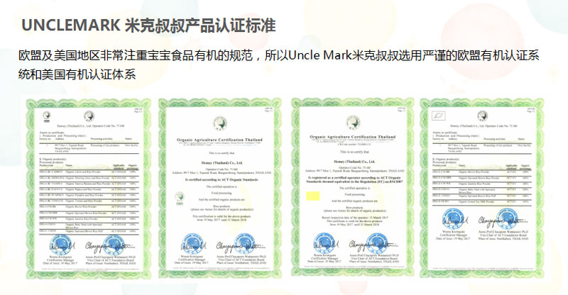 3.吃進肚子里的必須是安全的,米克叔叔產品已通過歐盟有機認證、美國有機認證、質量管理體系認證、國際食品安全認證、優(yōu)良制造標準認證等相關國際認證。