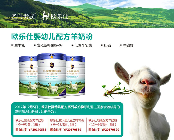 歐樂仕品牌羊奶粉即原名門貴族歐樂仕羊奶粉系列,于2017年12月份獲得國家食藥總局嬰粉注冊制審核,歐樂仕嬰幼兒羊奶粉工藝獨(dú)特,新鮮營養(yǎng),口碑極佳。