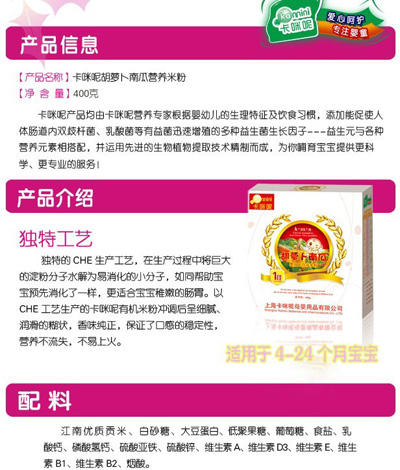 卡咪呢有機米粉系列是專為中國寶寶設(shè)計的營養(yǎng)輔食,選用有機大米,科學搭配維生素AD等維生素,還特別添加;撬、DHA、AA等有助智力發(fā)育的營養(yǎng)成分,富含15種營養(yǎng)素。現(xiàn)上?ㄟ淠啬笅胗闷酚邢薰久嫦蛉珖瞻资袌鰠^(qū)域誠招卡咪呢有機米粉代理商。
