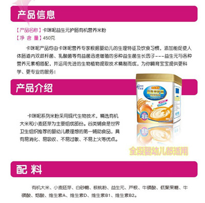 卡咪呢有機米粉系列是專為中國寶寶設(shè)計的營養(yǎng)輔食,選用有機大米,科學搭配維生素AD等維生素,還特別添加;撬、DHA、AA等有助智力發(fā)育的營養(yǎng)成分,富含15種營養(yǎng)素,F(xiàn)上?ㄟ淠啬笅胗闷酚邢薰久嫦蛉珖瞻资袌鰠^(qū)域誠招卡咪呢有機米粉代理商。