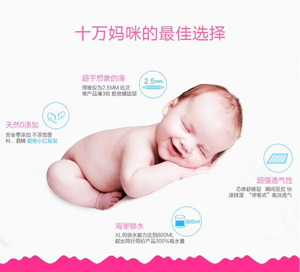 360°彈力貼身腰圍,超柔、超舒適。超柔3D打孔大珍珠面層,有效減少皮膚接觸,清新干爽,呵護寶寶小屁屁。干爽升級,雙層舒爽芯,進口住友+三大雅高分子完美配比,瞬間吸收、牢固鎖水。熱風新微孔高效排氣底膜,及時排除悶熱濕氣。 遇濕變色魔幻尿顯,及時發(fā)現(xiàn)寶寶的小秘密。自動外翻立體防側(cè)漏隔邊,防止側(cè)漏,寶媽更放心。根據(jù)中國寶寶體型設(shè)計,貼合臀部曲線,伸展自如。