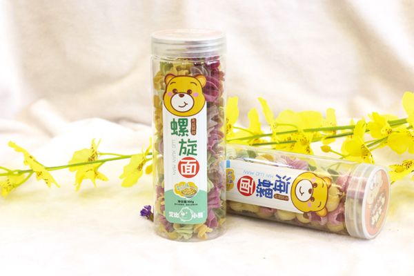 艾比小熊面條系列按造型分,有果蔬面、螺旋面、卡通面和海螺面;按口味分,有南瓜、混合、胡蘿卜、菠菜、甜菜等口味,以天然小麥粉為原料,小麥粉有著豐富的淀粉、蛋白質、粗纖維、脂肪油、蛋白質酶及微量元素等