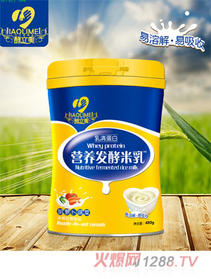 1.酵立美發(fā)酵米乳是以大米、小米等五谷和脫脂乳粉為主要原料,以腸胃道營養(yǎng)益生菌(嗜酸乳桿菌或動物雙歧桿菌)作發(fā)酵劑,經(jīng)烘烤、糊化、酶解、調(diào)配、菌解等工藝,制成口感細(xì)膩,質(zhì)地均勻,有大米或相應(yīng)五谷的焦奶香味,不添加食用色素和防腐劑的發(fā)酵米乳。