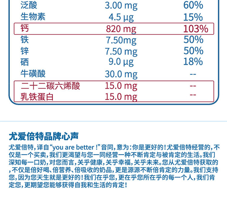尤愛倍特,譯自“you are better!”音同,意為:你是更好的!尤愛倍特經(jīng)營的,不僅是一個買賣,我們更渴望與您一同經(jīng)營一種不斷肯定與被肯定的生活。我們深知每一口奶,對您而言,關(guān)乎健康,關(guān)乎幸福,關(guān)乎未來。您從尤愛倍特獲取的,不僅是倍好喝、倍營養(yǎng)、倍吸收的奶品,更是源源不斷倍肯定的力量。我們支持您,因為您天生就是更好的!我們在乎您,更在乎您所在乎的每一個人,我們肯定您,更期望您能夠獲得自我和生活的肯定!