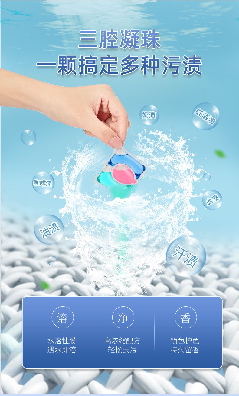 洗衣凝珠采用生物酶技術(shù),4倍濃縮,八倍潔凈,迅速分解污漬、油脂,除螨抑菌。精美凝珠,進(jìn)口水溶膜,遇水即溶,深入清潔,易漂易洗,無殘留物,持久留香。