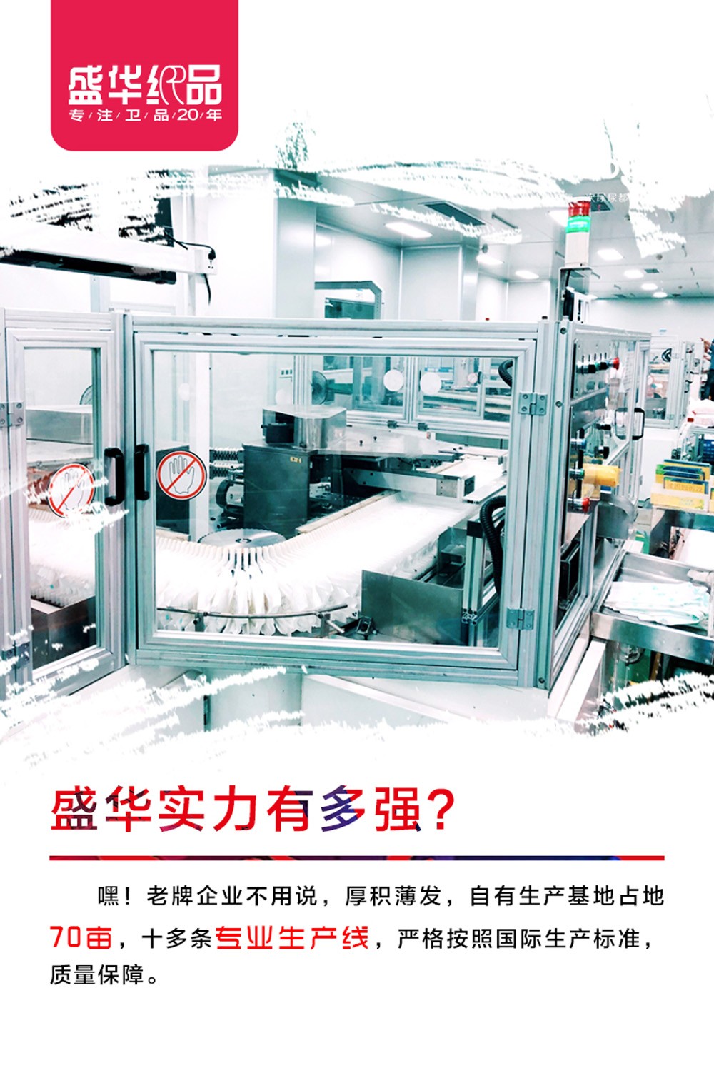 目前,公司現(xiàn)擁有全球領(lǐng)先的全伺服生產(chǎn)設(shè)備,其中,大環(huán)腰紙尿褲生產(chǎn)線3條、拉拉褲生產(chǎn)線2條、及配套美國諾信膠機設(shè)備,紙尿褲熱風(fēng)無紡布生產(chǎn)線2條、熱軋無紡布生產(chǎn)線2條及配套無紡布后處理設(shè)備、尿褲底膜印刷設(shè)備1臺、自主研發(fā)生產(chǎn)整套紙尿褲芯體材料,以及相關(guān)的堆垛機、自動噴碼機、自動稱重剔除機、全電腦污點檢測儀等,綜合年產(chǎn)值15個億,是中國市場屈指可數(shù)的擁有全產(chǎn)業(yè)鏈設(shè)備的衛(wèi)生用品企業(yè)。也更加彰顯了盛華公司的產(chǎn)業(yè)集群效應(yīng)與成本領(lǐng)先的戰(zhàn)略構(gòu)想,并必將為企業(yè)的永續(xù)發(fā)展貢獻澎湃的動力。