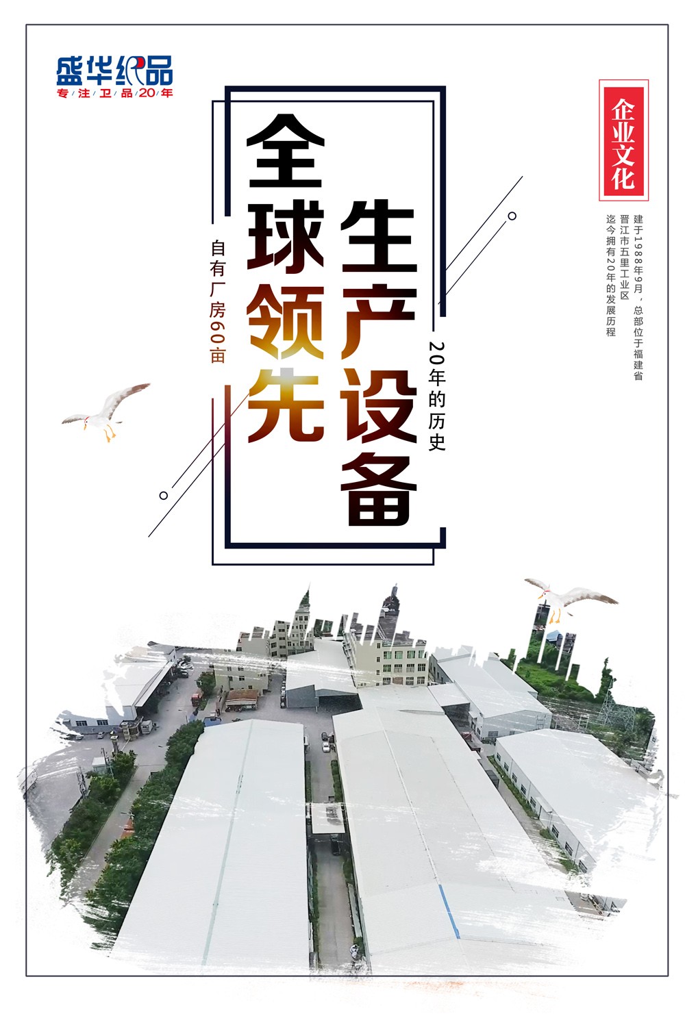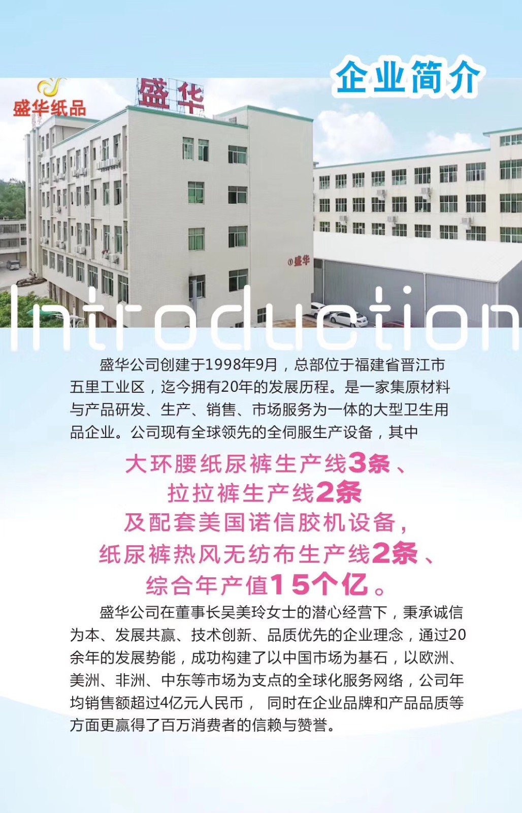 盛華紙品有限公司創(chuàng)建于1998年9月,總部位于福建省晉江市五里工業(yè)區(qū),迄今擁有22年的發(fā)展歷程。是一家集原材料與產(chǎn)品研發(fā)、生產(chǎn)、銷售、市場服務(wù)為一體的大型衛(wèi)生用品企業(yè)。