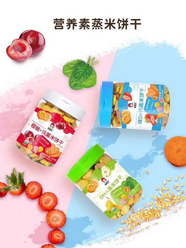 果蔬妃【營養(yǎng)素蒸米果蔬餅干】是融合了多種谷物和果蔬成分的小動物造型餅干,采用蒸米工藝,清香酥脆,口齒留香!特別加入營養(yǎng)素,營養(yǎng)更豐富,有DHA、櫻桃+鐵和維D+鈣3種口味,適合9個月以上寶寶食用。