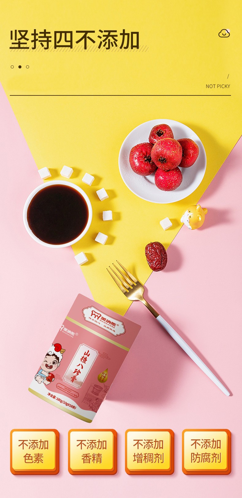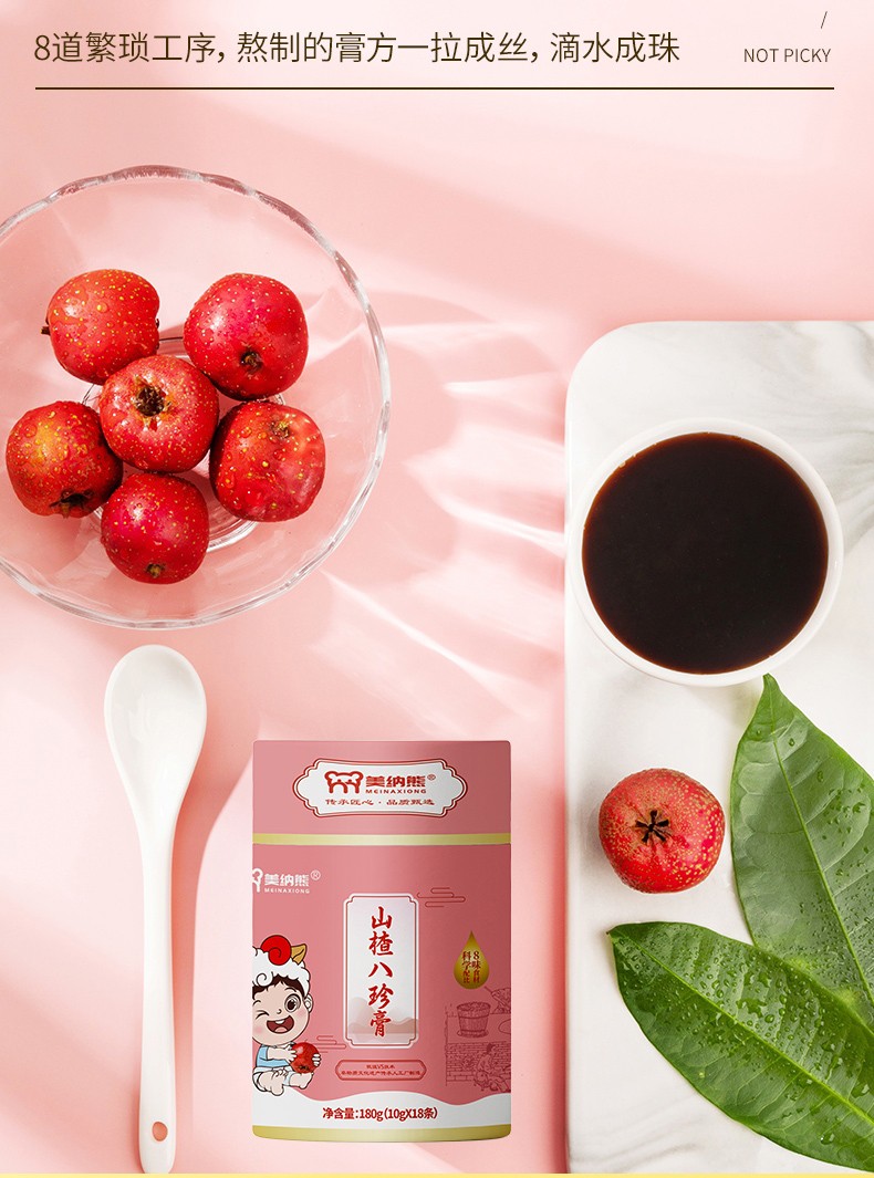 美納熊山楂八珍膏,以山楂、紅棗、蓮子、山藥、茯苓、蜂蜜等為主要原料,地道取材,原料新鮮,選材、清晰、浸泡、熬制、濃縮、化膏、過濾、收膏,8道繁瑣工序,熬制的膏方一拉成絲,滴水成珠,不添加色素、香精、增稠劑、防腐劑。