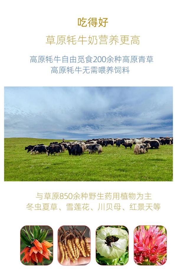 奶源來自麥洼牧場,獲得中國、歐盟、美國三重有機認證及國家地理標志保護。高原牦牛奶自由覓食200余種高原青草,自然放牧,逐水草而居,吃得好,營養(yǎng)更高。