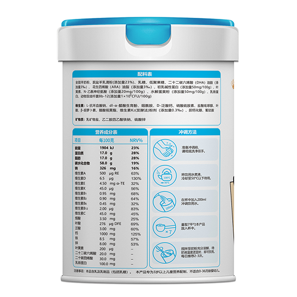 慧滋小狀元兒童成長配方羊奶粉,甄選奶源,嚴(yán)選產(chǎn)地,采用先進(jìn)自動(dòng)化生產(chǎn)設(shè)備,產(chǎn)品經(jīng)過嚴(yán)格檢驗(yàn),多重保障,品質(zhì)放心。根據(jù)成長階段營養(yǎng)需求科學(xué)配比多重營養(yǎng)素,每100g中含脫鹽羊乳清粉23g、乳鐵蛋白100mg、水解蛋黃粉50mg、初乳堿性蛋白50mg,更添加動(dòng)物雙歧桿菌Bb-12、益生元、葉黃素、DHA&ARA、N-乙酰神經(jīng)氨酸,以及多種維生素與礦物質(zhì)等微量元素,合理配比,營養(yǎng)美味,奶香濃郁,親和好吸收,給力護(hù)成長。