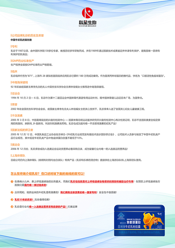 中科乳珍,中國(guó)科學(xué)院生命科學(xué)研究院研制,35年有效臨床經(jīng)驗(yàn)!民族品牌,藍(lán)帽品質(zhì)!每粒含免疫球蛋白36mg,遠(yuǎn)高于市場(chǎng)上的同類產(chǎn)品,特采用ASP活性物質(zhì)保鮮技術(shù),為免疫力低下人群精心研發(fā)設(shè)計(jì)!嬰幼兒、兒童、成人均可食用,經(jīng)動(dòng)物及功能實(shí)驗(yàn)評(píng)價(jià),具有免疫調(diào)節(jié)的保健功能!
